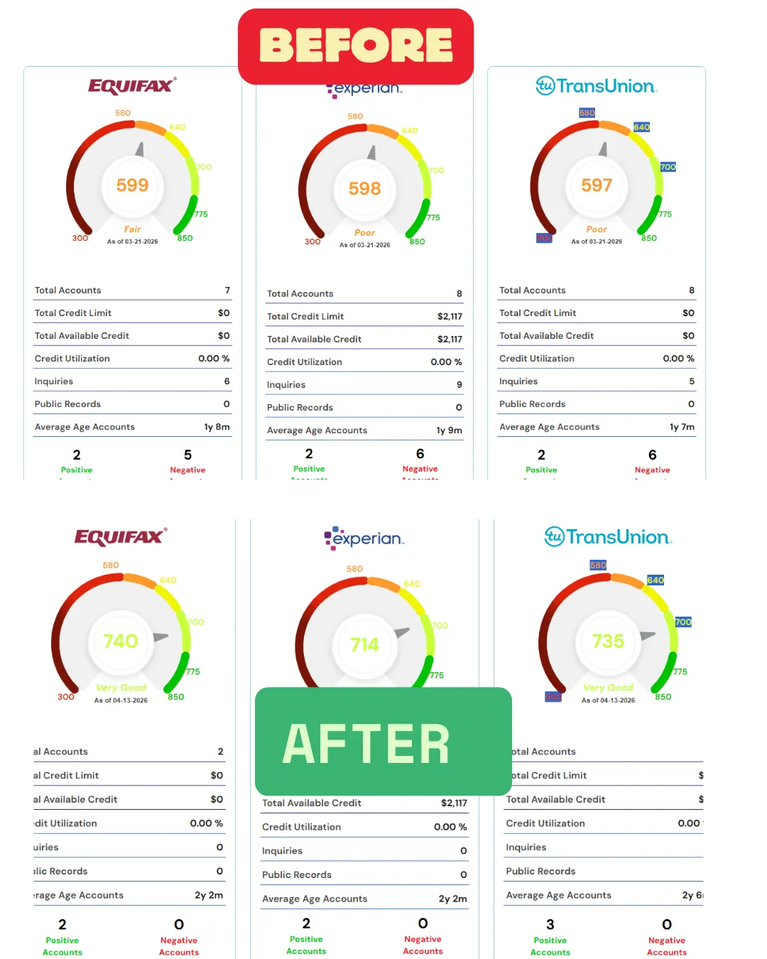 Most clients begin to see improvements within 30–90 days, depending on their credit situation. Timelines depend on the number of negative items, how recent or severe they are, and credit bureaus response times.